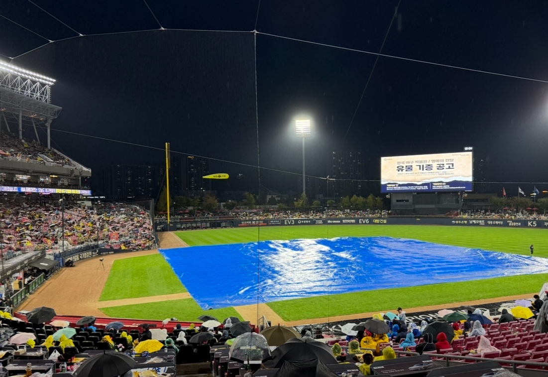 경기 강행에 대한 의지가 큰 상황에서 빗줄기가 가늘어지면 방수포를 걷어내고, 선수단이 나와 몸도 풀었지만, 바로 다시 빗방울이 굵어지며 방수포를 치는 상황이 여러 차례 반복됩니다.
