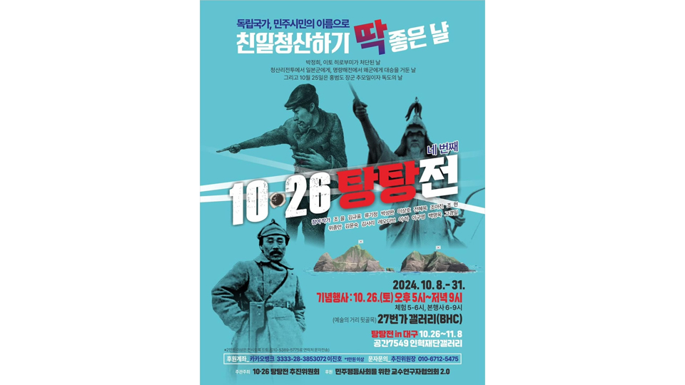 친일 청산 완결을 위한 '친일 청산하기 좋은 날 10·26 탕탕 박람회'가 10월 26일부터 11월 8일까지 대구 인혁재단 갤러리 공간에서 열립니다.