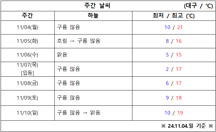 11월 1주 차 아침 기온 2도에서 10도, 낮 기온 15도에서 21도 예상됩니다.
