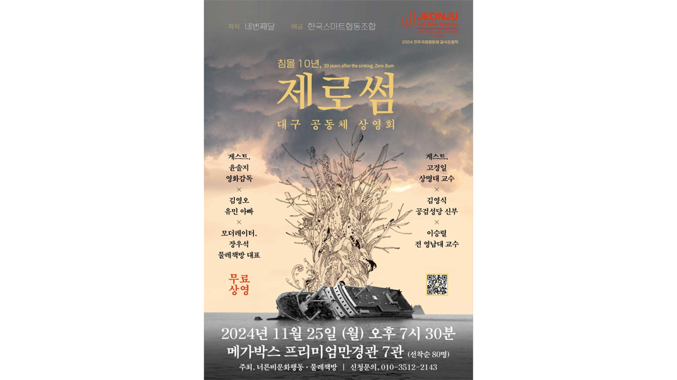 세월호 참사 10주년을 맞아 참사 원인을 파헤치는 다큐멘터리 영화 '제로썸'이 11월 25일 대구에서 상영됩니다.