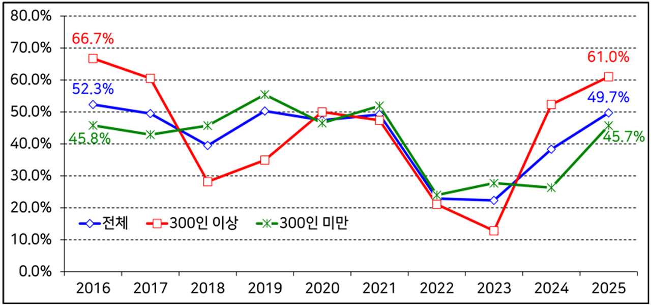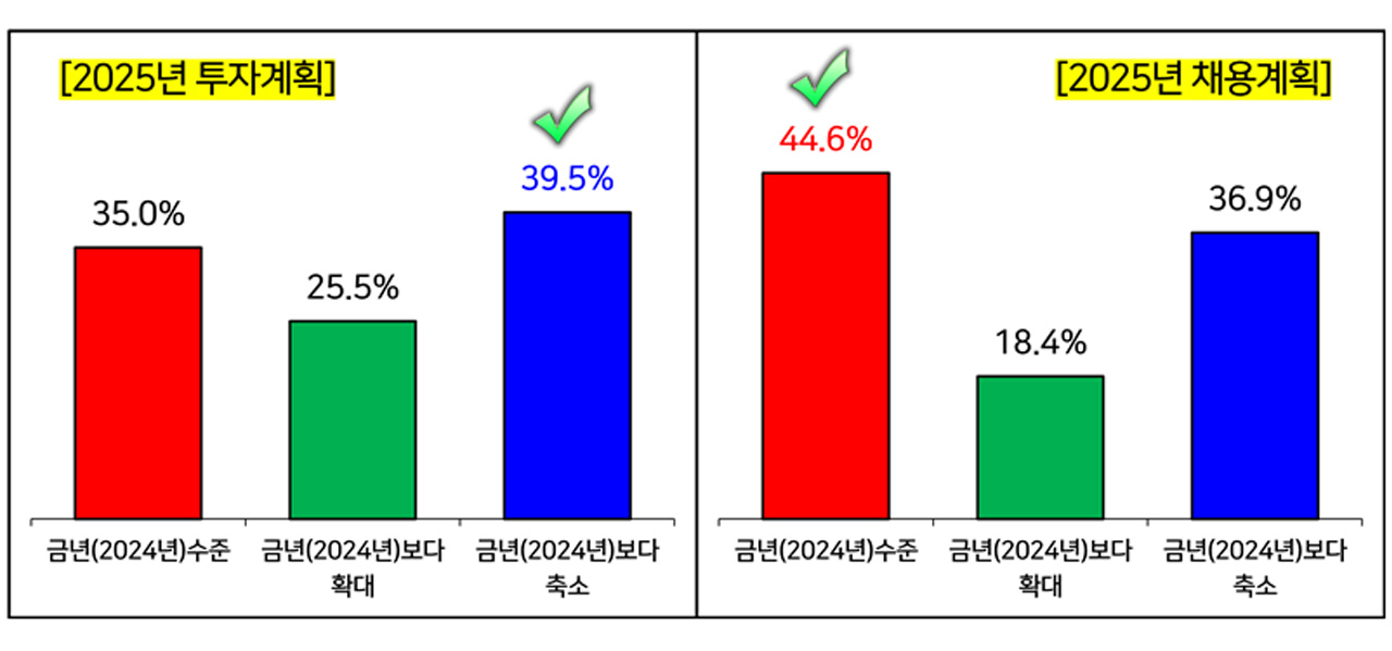 2025년 투자 축소 39.5%, 채용은 2024년 수준 44.6%···기업 규모 클수록 '채용 축소' 응답 많아