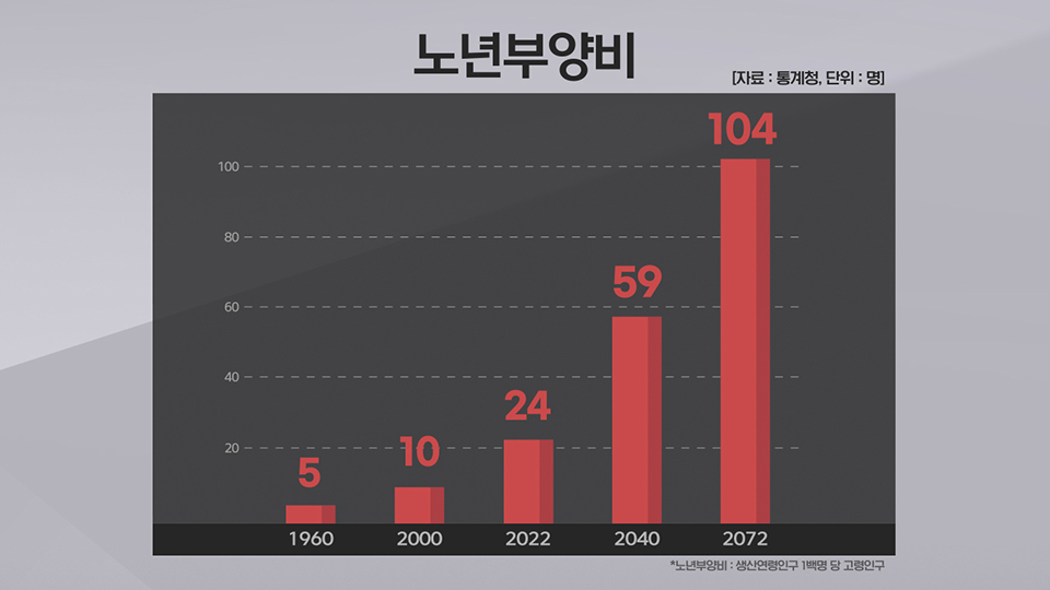 통계청에 따르면 생산연령인구 100명당 부양하는 고령인구 비율은 2022년 24명에서 2040년 59명, 2072년 104명 수준으로 늘어납니다.