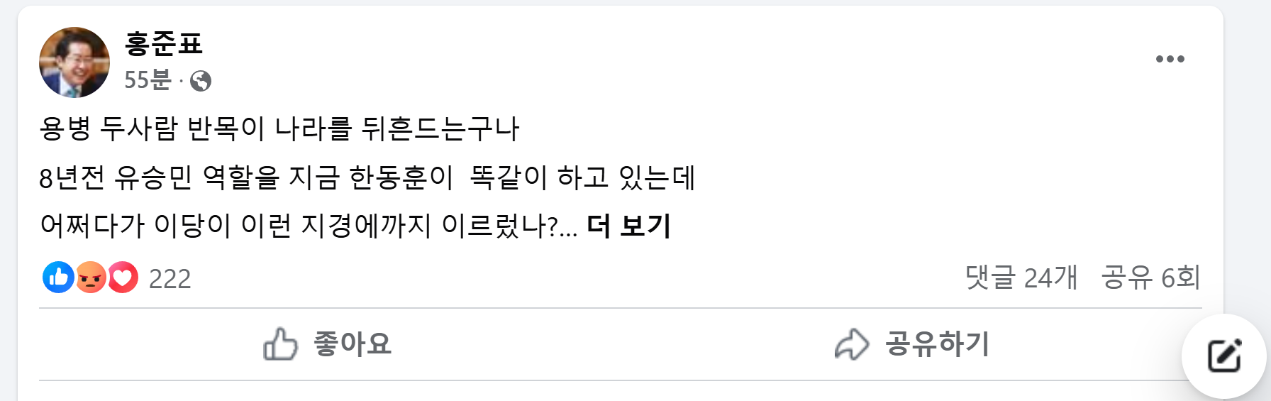 홍준표 시장은 12월 6일 오전 자신의 SNS에서 "용병 두 사람 반목이 나라를 뒤흔들고 있다"며 "8년 전 유승민 역할을 지금 한동훈이 똑같이 하고 있는데 어쩌다가 이 당이 이런 지경에까지 이르렀는가"라며 한 대표를 직격했습니다.