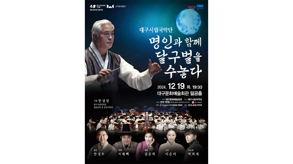 대구시립국악단 제215회 정기연주회 '명인과 함께 달구벌을 수놓다' 공연이 12월 19일 저녁 7시 30분 대구문화예술회관 팔공홀에서 열립니다.