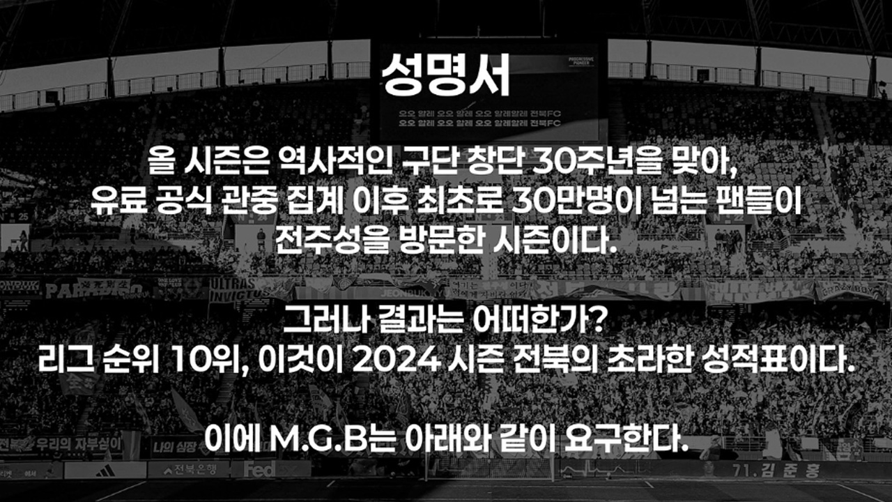 전북 서포터즈들은 입장문을 발표하고, '김두현 감독 사퇴', '프런트 쇄신', '공개 간담회' 등을 강하게 요청하고 있습니다.