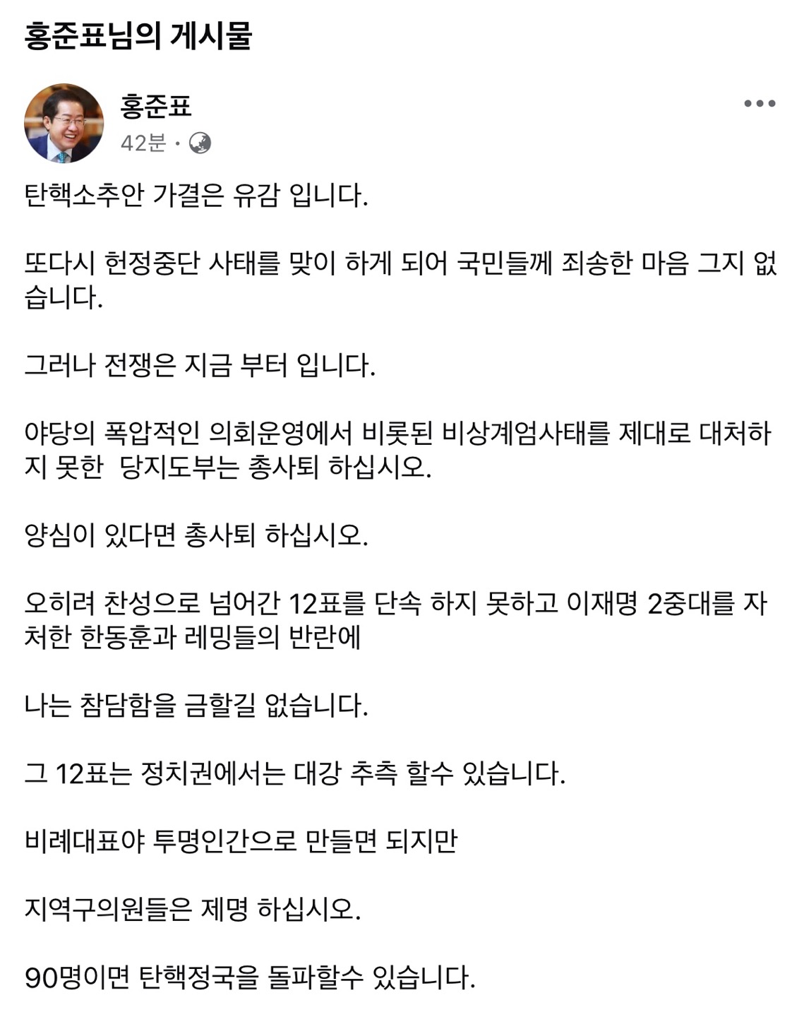이어 "그러나 전쟁은 지금부터다"라며 "야당의 폭압적인 의회 운영에서 비롯된 비상 계엄 사태를 제대로 대처하지 못한 당 지도부는 양심이 있다면 총사퇴하라"고 촉구했습니다.