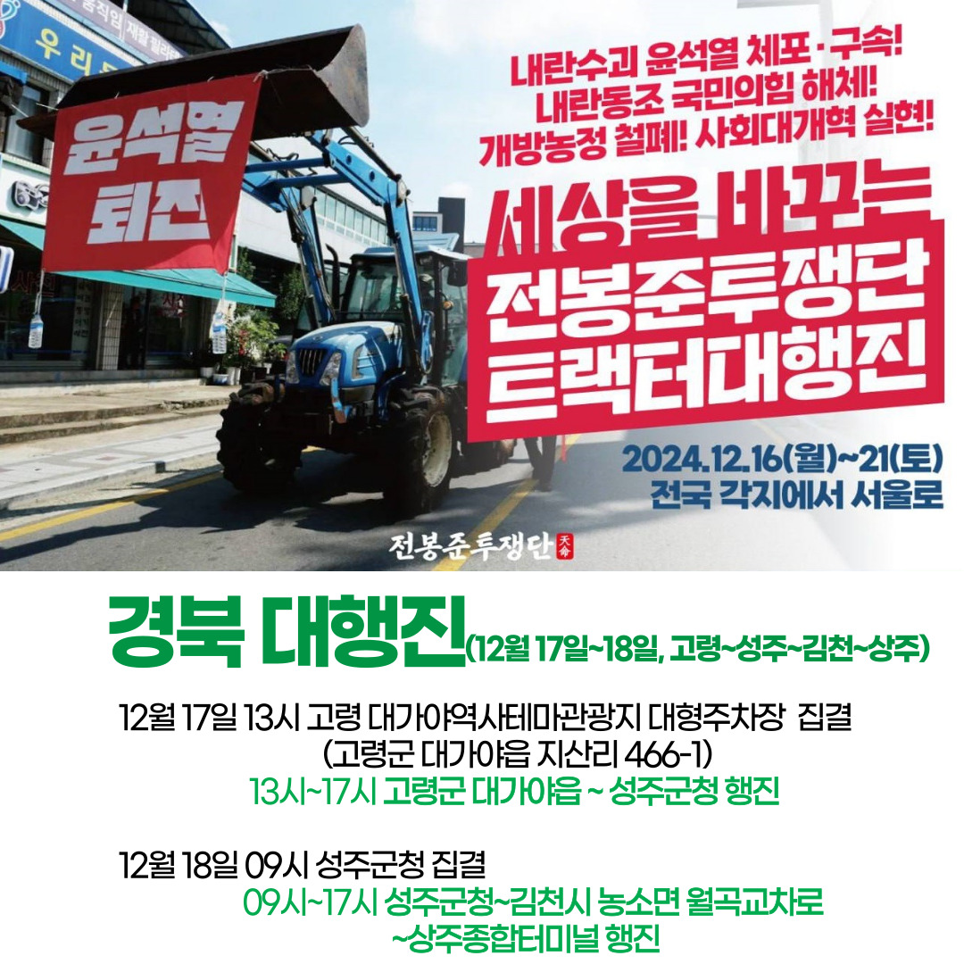 전국농민회총연맹 경북도연맹은 세상을 바꾸는 전봉준 투쟁단이 12월 17일 오후 1시 30분 경북 고령 대가야역사테마관광지 주차장을 출발해 고령군청을 거쳐 성주군청까지 트랙터 행진을 하면서 "윤석열 대통령에 대한 즉각적인 체포와 구속을 촉구"할 예정이라고 밝혔습니다.