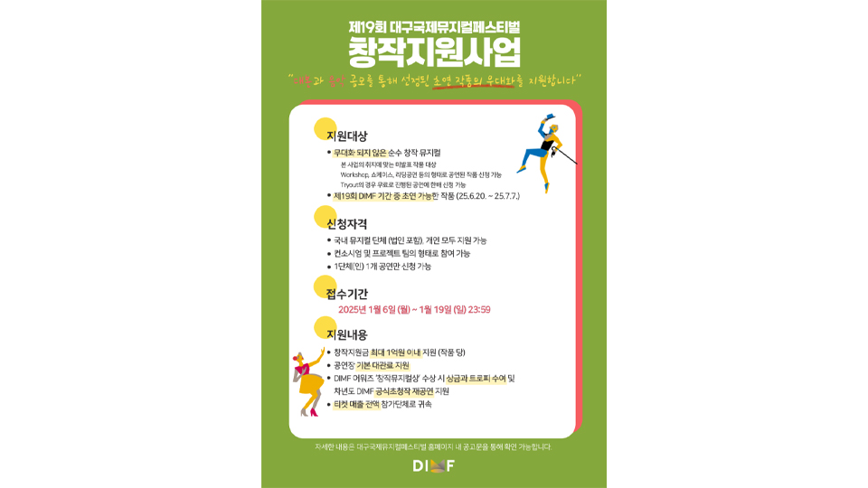대구 국제 뮤지컬 페스티벌이 2025년 1월 6일부터 19일까지 '제19회 DIMF 창작 지원사업' 공모 신청을 받습니다.