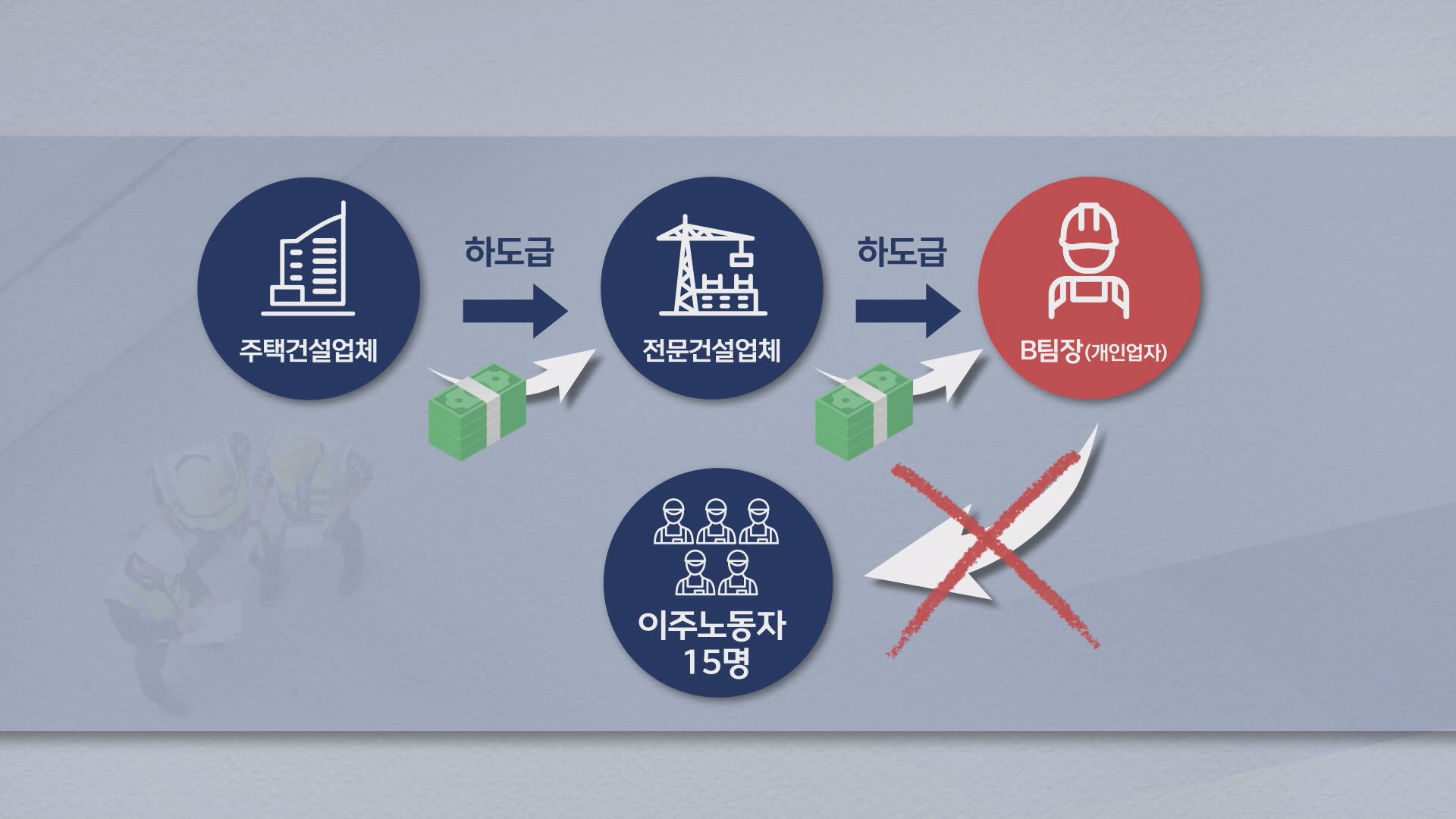 이 현장에서는 원청업체인 주택건설업체가 콘크리트·철근 공사를 전문건설업체에 하도급 줬고, 이 업체는 다시 팀장 역할을 하던 개인업자 B 씨에게 일부 공사를 맡겼습니다.