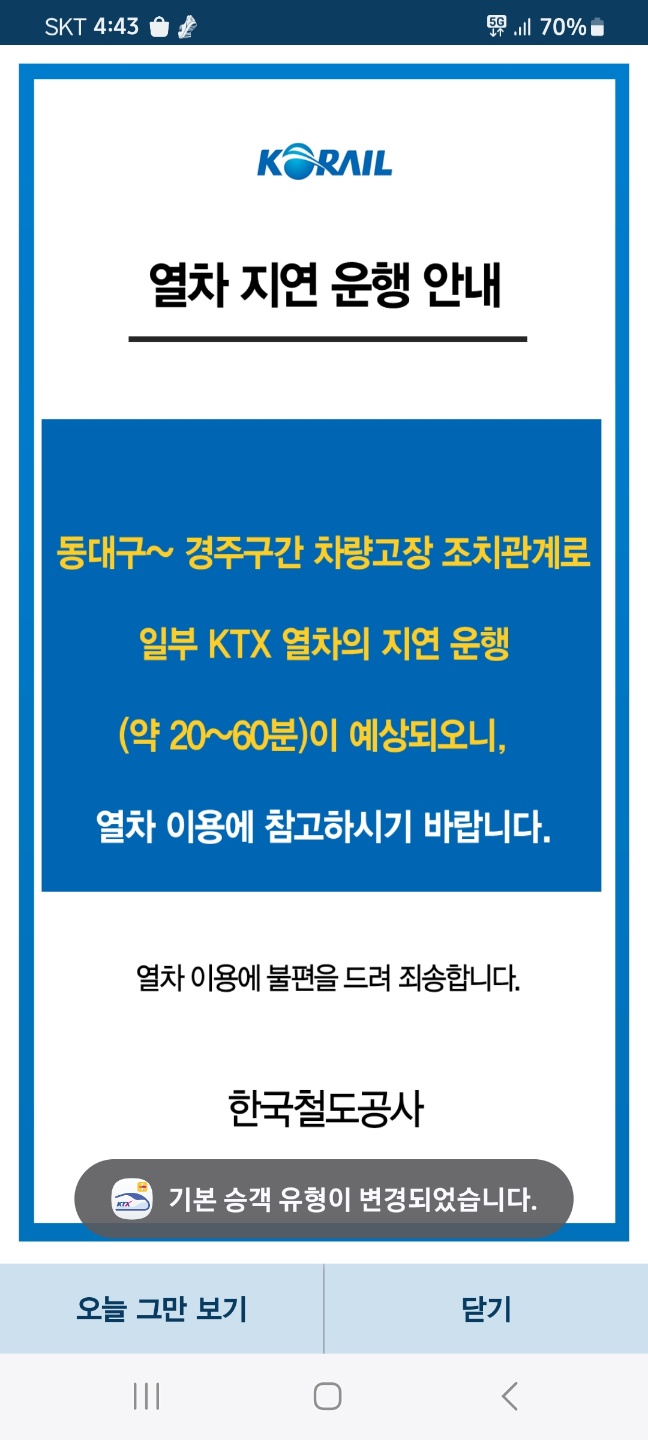 21일 오후 2시 26분쯤 수서발 부산행 SRT 329호 열차가 동대구역과 경주역 사이에서 고장으로 멈춰 섰습니다.