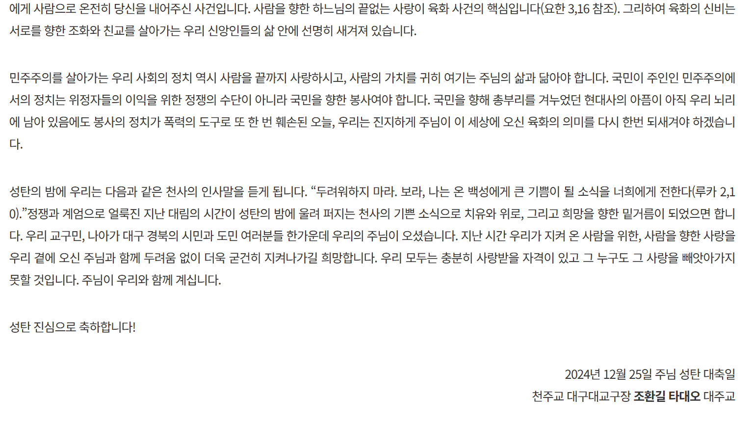 조 대주교는 성탄절을 하루 앞둔 12월 24일 천주교 대구대교구 인터넷 홈페이지에 올린 '2024년 교구장 성탄 담화문'에서 "지난 1년 우리 사회는 대립과 갈등의 시간을 애써 견뎌왔습니다. 저마다 지닌 가치관과 저마다 갈망하는 자신의 이익에 따른 정치·경제적 극한 대립의 시간 또한 우리를 안타깝게 했습니다"라며 "무엇보다 지난 12월 3일, 민의의 전당인 국회가 총을 든 군인들로 위협을 받는 시대착오적 사태까지 맞닥뜨리고 말았습니다."라고 현 시국에 대한 안타까움을 드러냈습니다.