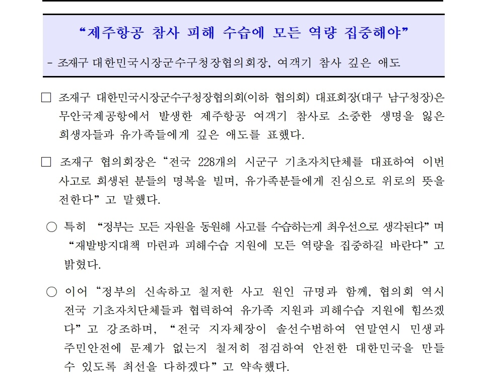 제주항공 여객기 참사에 대해 대한민국 시장 군수 구청장 협의회도 애도의 뜻을 밝혔습니다.