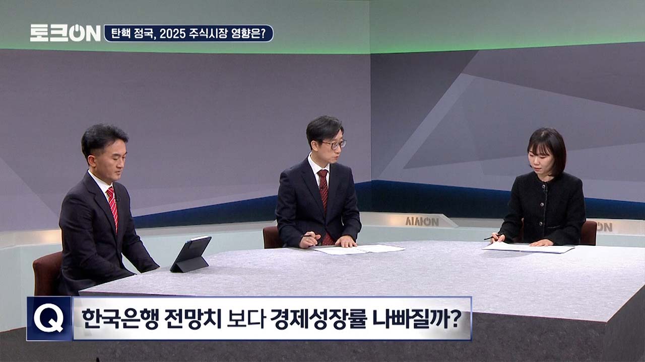 이번 주 토크ON은 탄핵 정국 등 여러 가지 불확실성 속에서 맞이하게 되는 2025년 새해 증시 전망과 경제에 미치는 여러 어려움에 대해 말씀 나눴습니다. 오늘 좋은 말씀 주신 두 분, 황세운 자본시장연구원 연구위원, 옥영경 DGB금융지주 전략경영연구소 연구위원, 두 분께 감사드립니다.