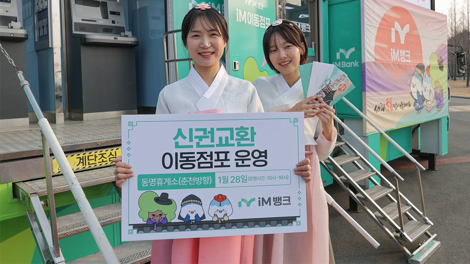 iM뱅크는 설 명절을 맞아 오는 설 하루 전인 1월 28일 중앙고속도로 춘천 방향 동명휴게소에서 iM이동점포를 운영합니다.