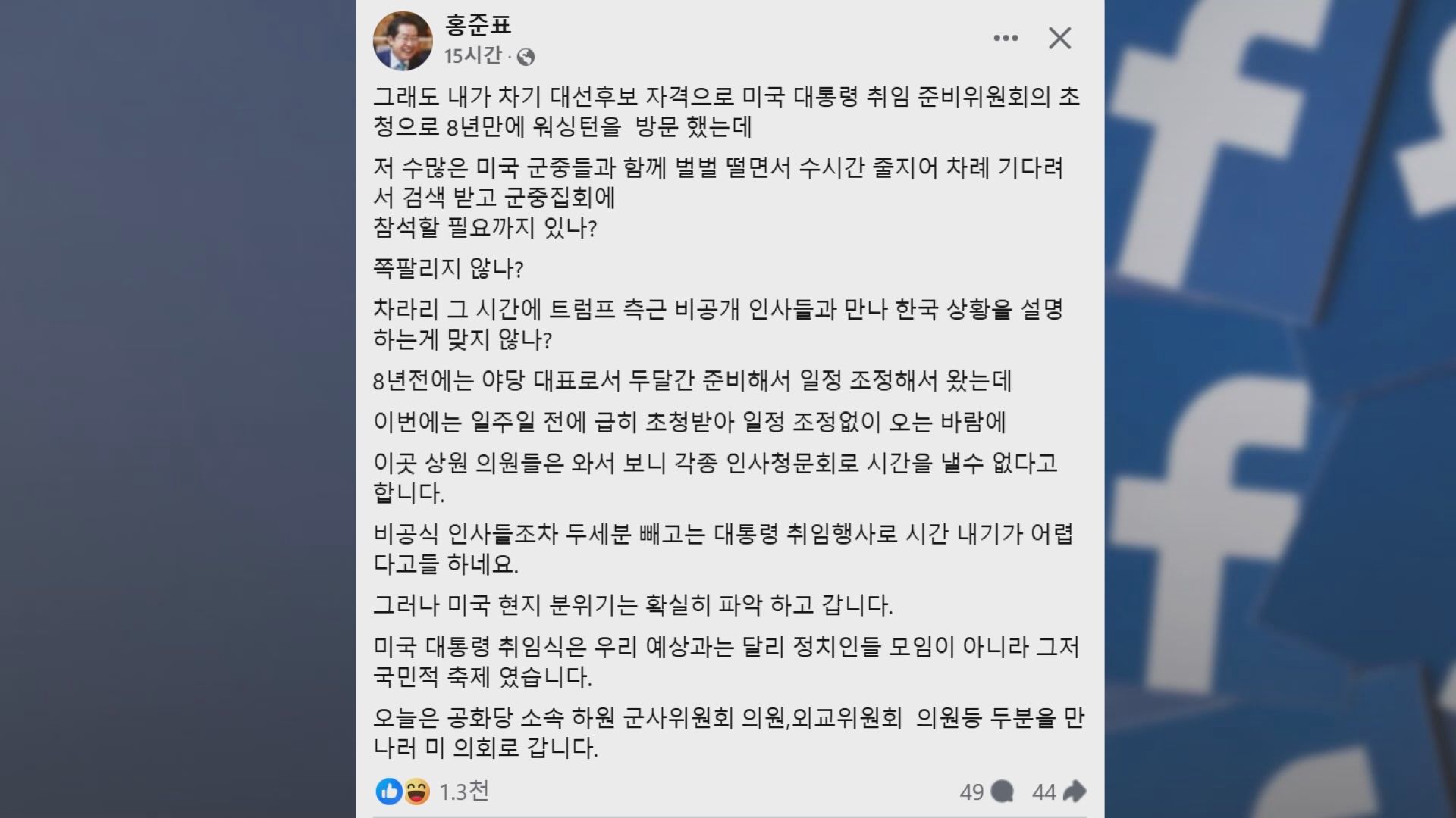 홍 시장 뿐만 아니라 취임식 참석 차 미국으로 간 사람들이 많았습니다.