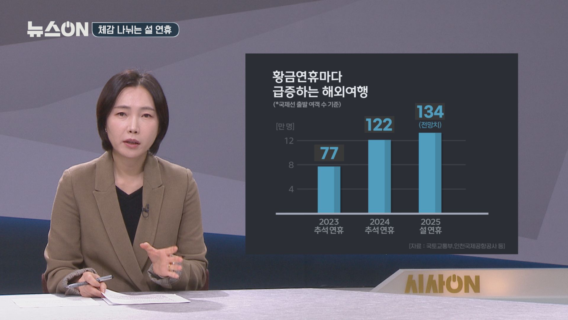일 평균 출발 승객은 13만 4천 명인데요. 지난해 설 연휴 일 평균 출발 승객은 11만 7천 명이었으니 13.8% 늘었습니다.