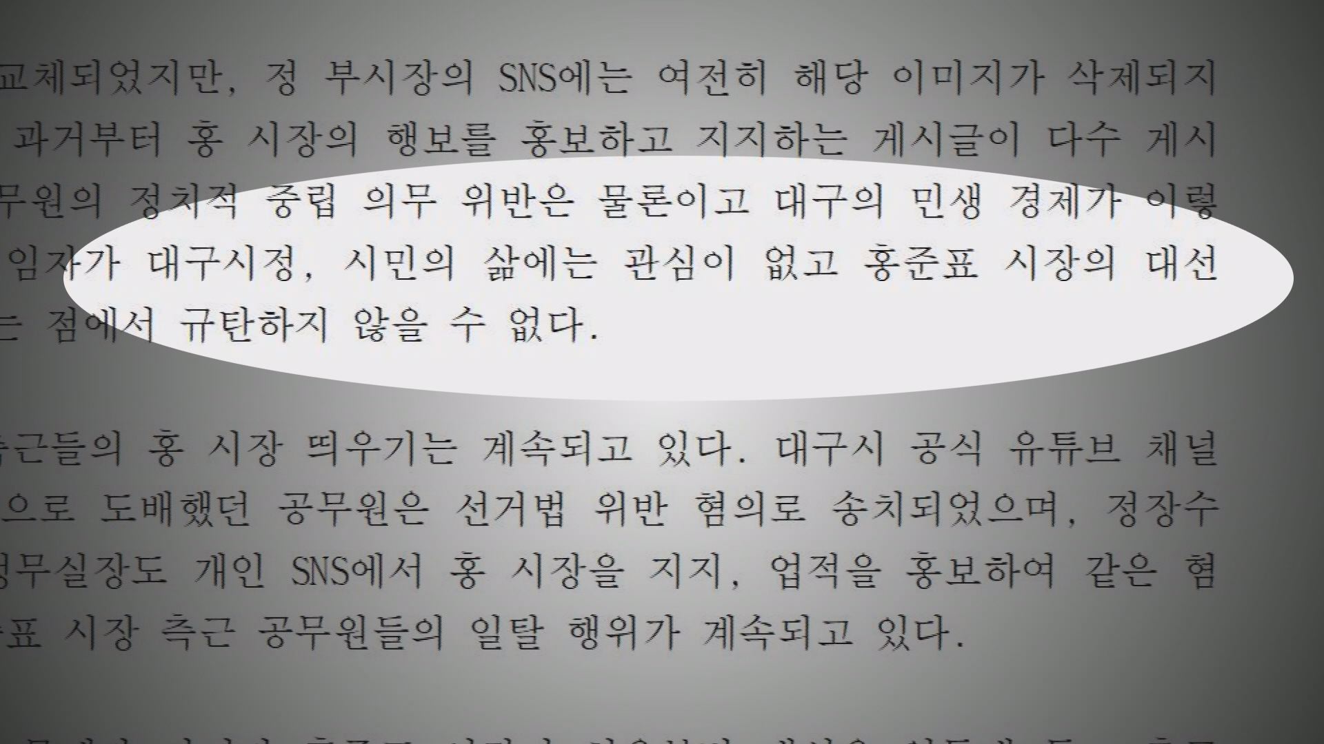 조영태 대구 참여연대 정책부장은 "홍준표 시장을 이렇게 홍보하고 있다는 것은 공무원의 정치적 중립 위반은 물론이고 선거법 위반 여부도 진지하게 다퉈봐야 할 문제라고 생각하고 있다"라고 지적했습니다.