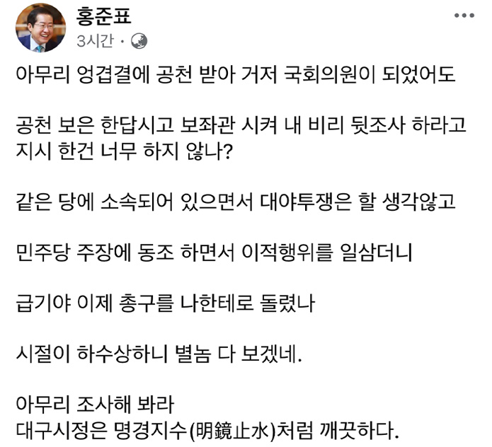 홍 시장은 2월 24일 자신의 SNS에 "아무리 엉겁결에 공천받아 거저 국회의원이 되었어도 공천 보은한답시고 보좌관 시켜 내 비리 뒷조사하라고 지시한 건 너무 하지 않나"라며 글을 올렸습니다.