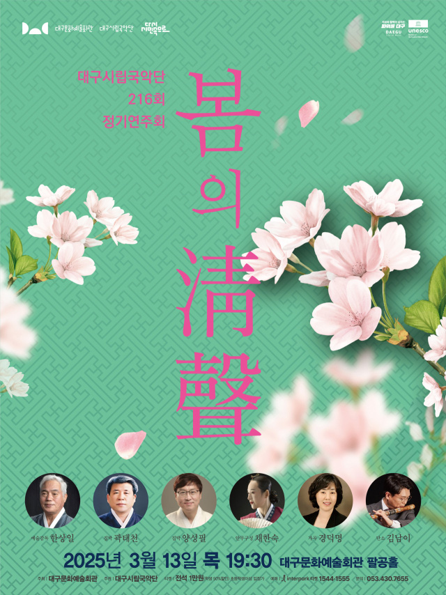 대구시립국악단 제216회 정기연주회가 3월 13일 저녁 7시 30분 대구문화예술회관 팔공홀에서 열립니다.