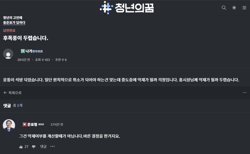 홍 시장은 자신의 정치플랫폼인 '청년의 꿈' 청문홍답 페이지에서 한 네티즌이 윤 대통령 석방이 '홍 시장님께 악재가 될까 두렵다'고 글을 올리자 '그건 악재 여부를 계산할 때가 아니다', '바른 결정을 한 것'이라고 답변했습니다.