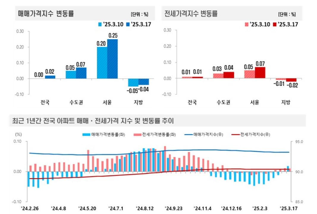 전국 아파트 매매가격은 0.02% 상승, 전셋값은 0.01% 상승을 기록했습니다.