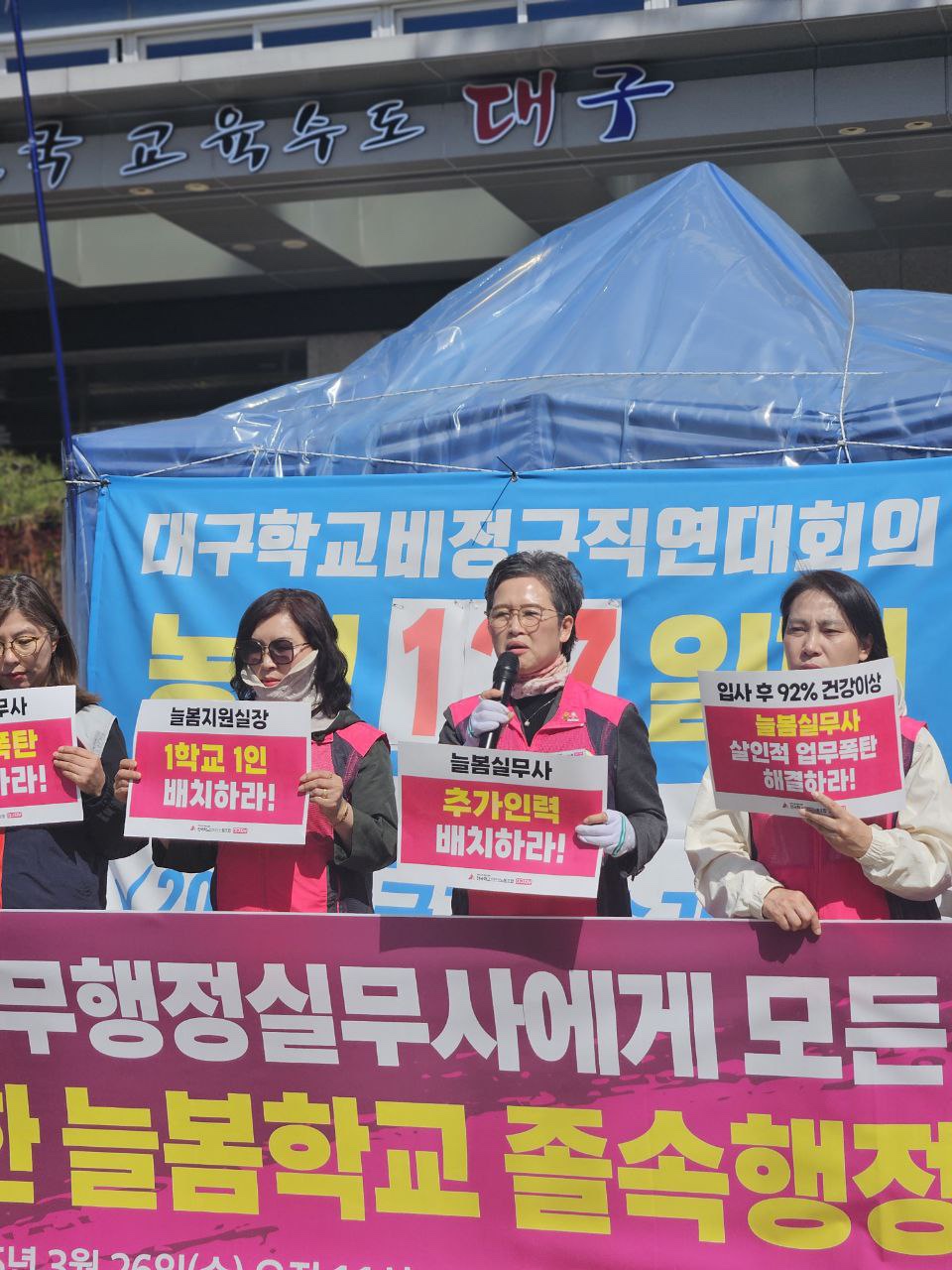 전국학교비정규직노조 대구지부는 3월 26일 오전 대구시교육청 앞에서 기자 회견을 열고 "대구시교육청이 올해부터 본격적으로 시행한 늘봄학교 운영과 관련해 실무자들에게 과도한 업무를 전가했다"고 주장했습니다.