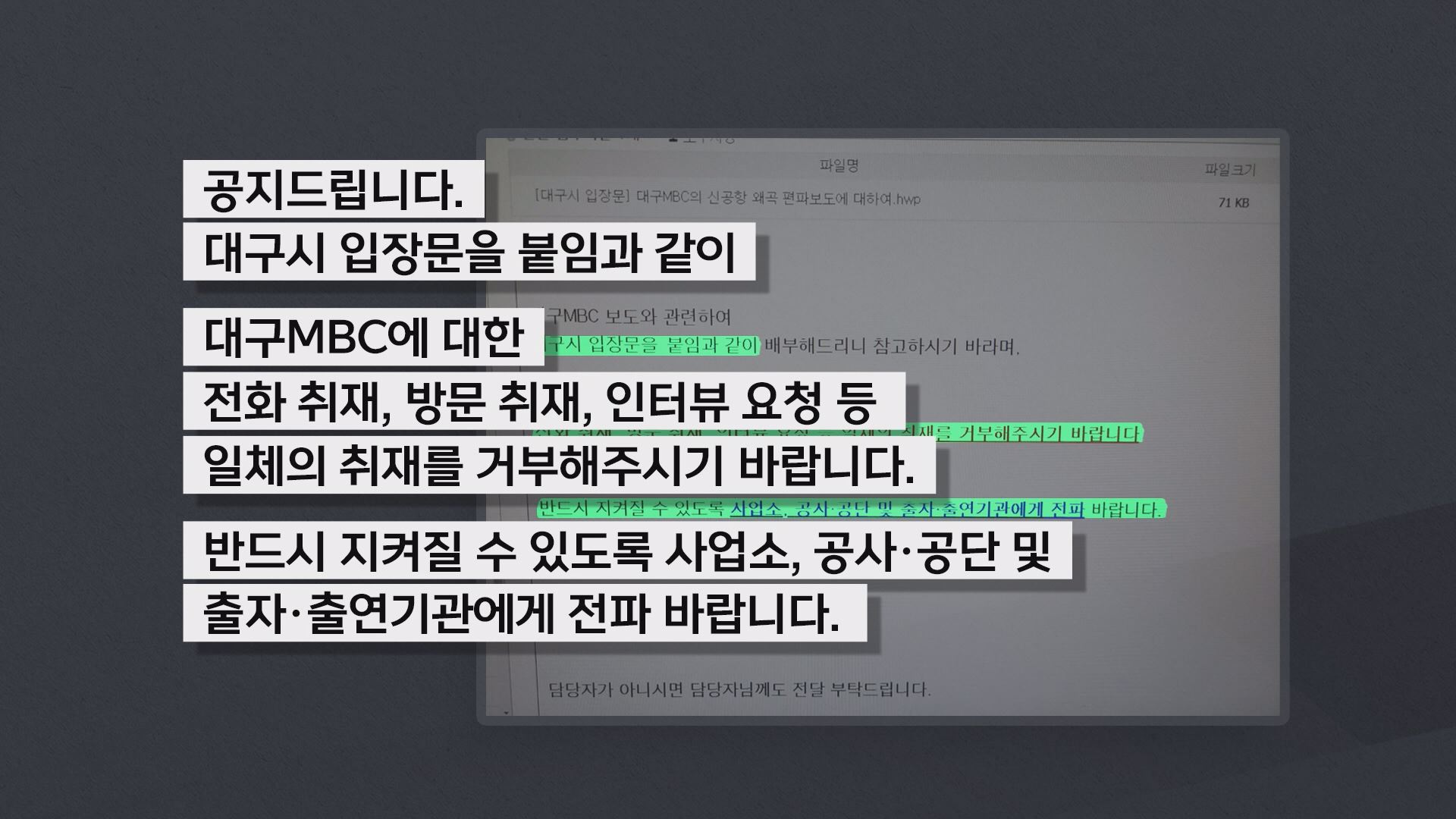 대구시는 긴급 공지로 사업소와 공사, 공단, 산하기관, 출자 출연기관까지 전 직원에게 '대구시 입장문'이라는 이름으로 대구MBC에 대한 전화나 방문, 인터뷰 등 일체의 취재를 거부하라고 한 지시도 했습니다.