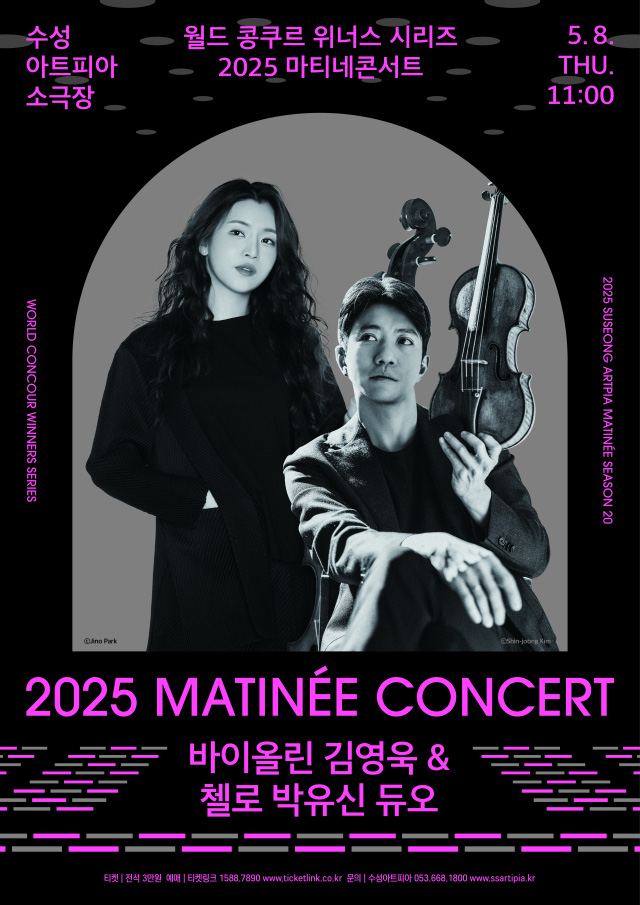 수성아트피아는 5월 8일 오전 11시 소극장에서 마티네 콘서트 '월드 콩쿠르 위너스 시리즈'의 두 번째 공연으로 바이올리니스트 김영욱과 첼리스트 박유신의 합동 콘서트를 엽니다.