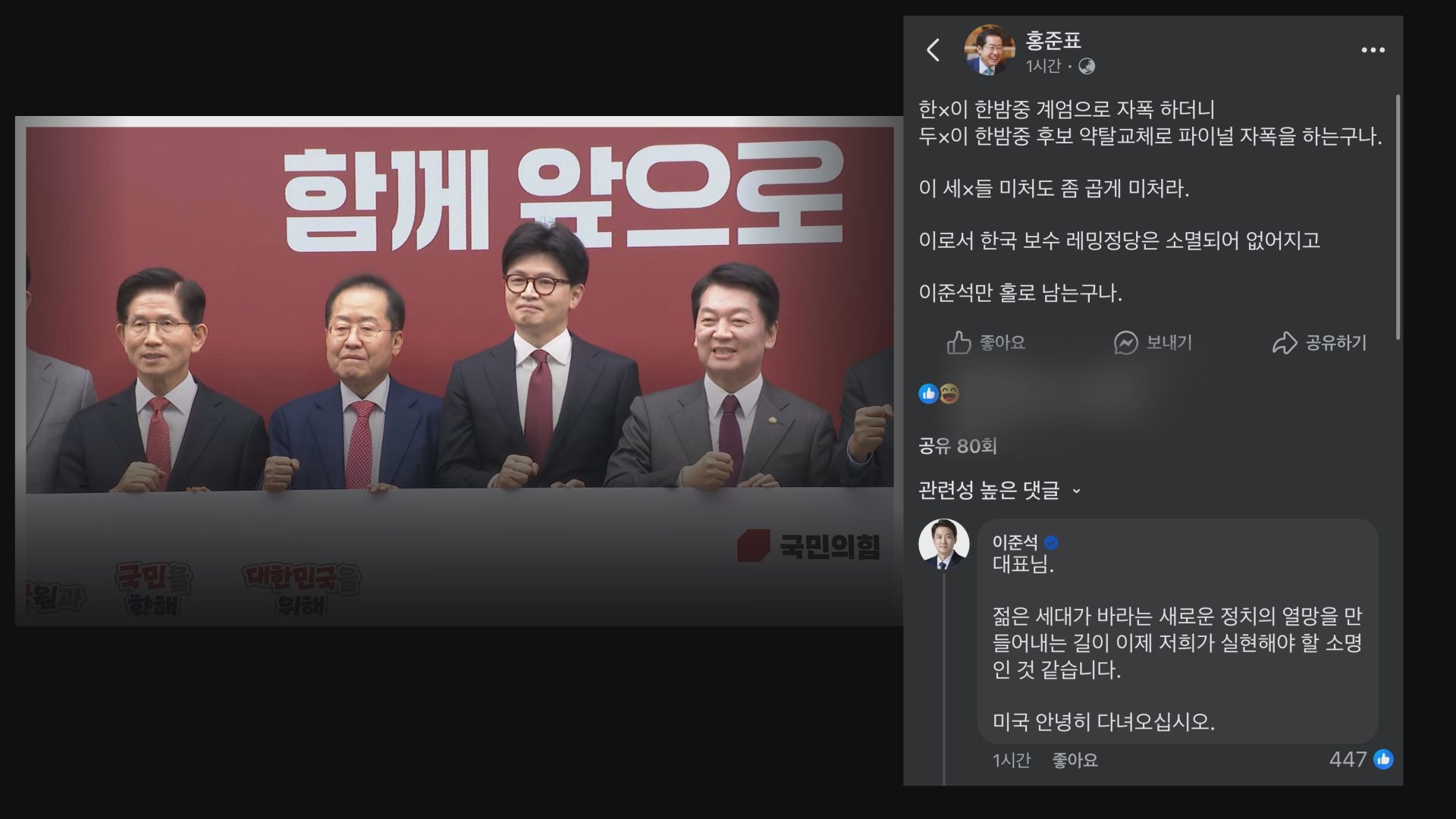 홍준표 전 대구시장은 5월 10일 자신의 SNS에 "하나가 한밤중 계엄으로 자폭하더니, 둘이 한밤중 후보 약탈 교체로 파이널 자폭을 한다"라며 "미쳐도 곱게 미치라"고 국민의힘 지도부를 강하게 비난했습니다.