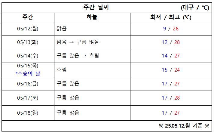 5월 2주 차 아침 기온 9도에서 17도, 낮 기온 24도에서 28도 예상됩니다.