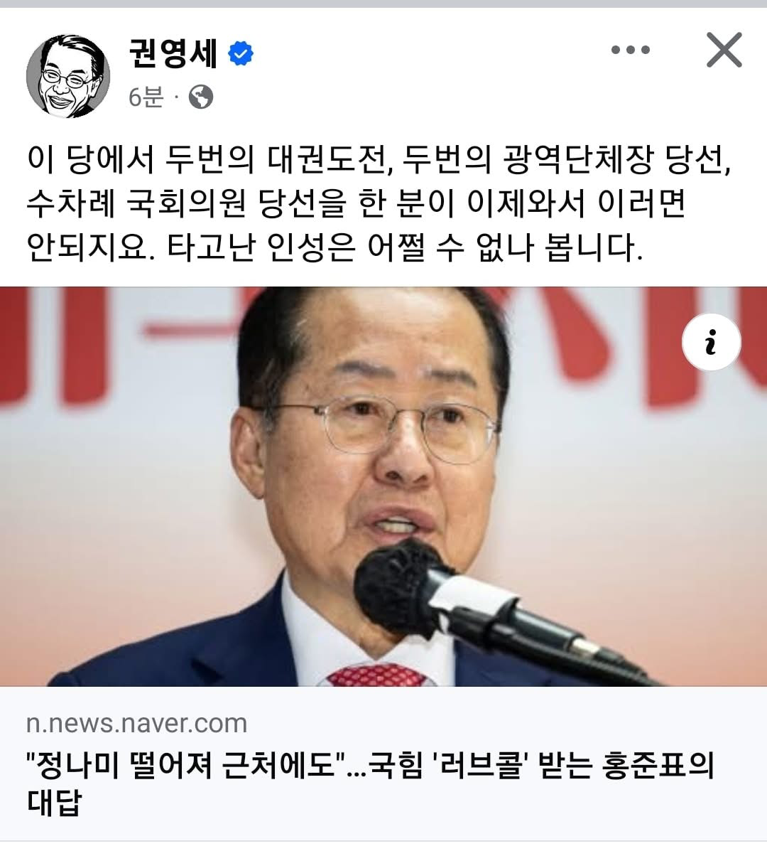권 전 위원장은 5월 14일 자신의 SNS에 홍 전 시장을 겨냥해서 "이 당에서 두 번의 대권 도전, 두 번의 광역단체장 당선, 여러 차례 국회의원 당선을 한 분이 이제 와서 이러면 안 된다"라며 "'타고난 인성'은 어쩔 수 없나 보다"라는 글을 올렸습니다.
