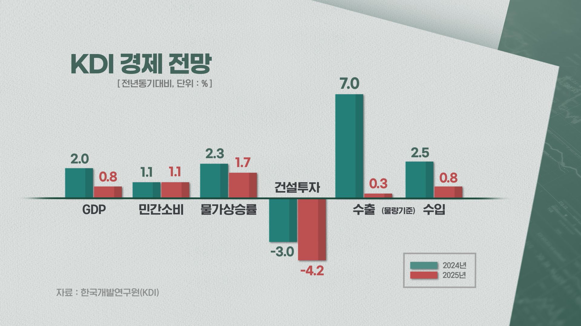 KDI는 0.8%P 하향 조정 중에서 대외 충격, 미국의 관세 인상에 따른 교역 위축, 수출 부진이 O.5%P로 산출됐다고 설명했습니다.
