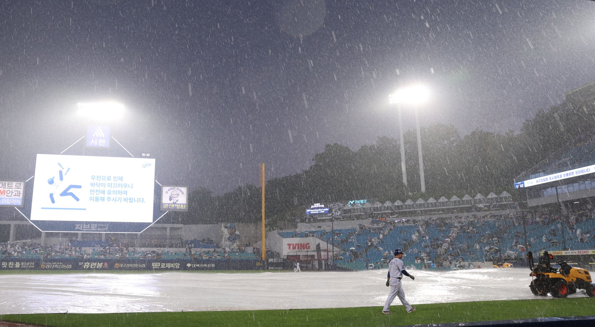 천둥과 번개가 이어지던 라이온즈파크는 비가 그리 굵지 않아 경기를 시작했지만, 1회 초 원아웃 상황에서 갑자기 쏟아진 폭우로 결국 경기를 이어가지 못합니다.