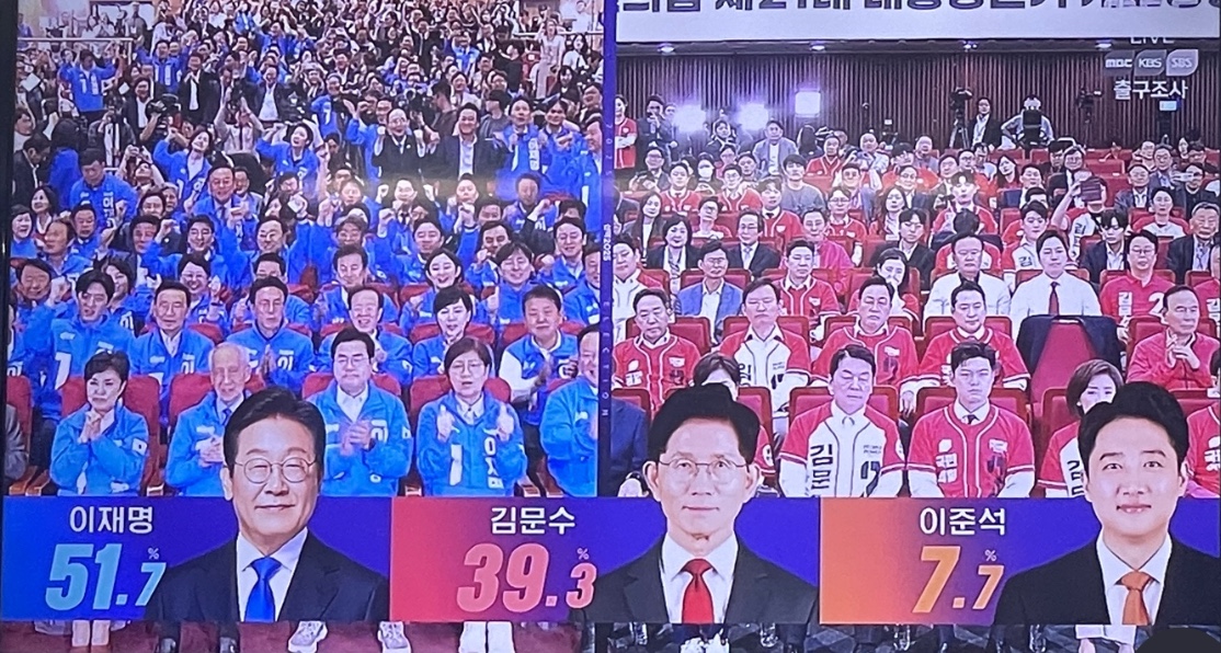 방송 3사가 실시한 출구조사에 따르면 민주당 이재명 후보 51.7%, 국민의힘 김문수 후보 39.3%, 개혁신당 이준석 후보는 7.7%를 얻을 것으로 나타났습니다.