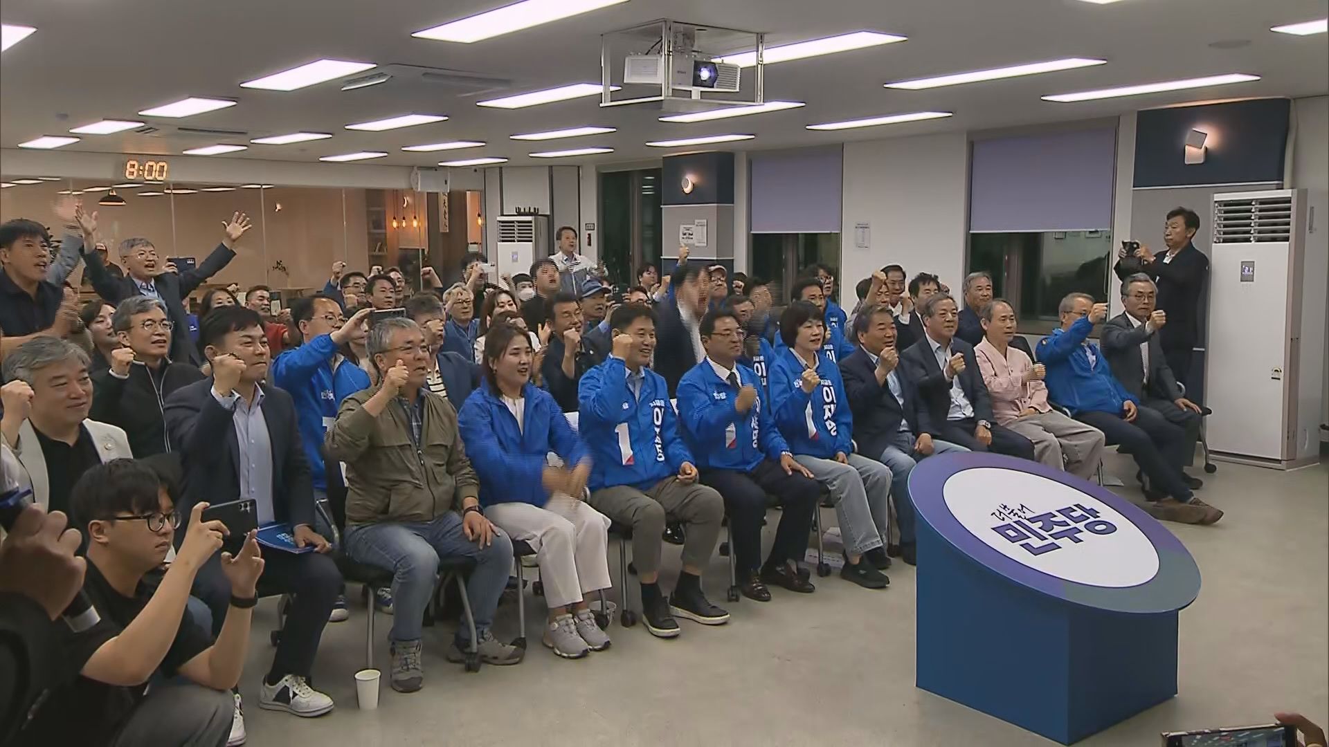 지도부는 기대감에 찬 표정으로 모니터 앞에 앉아 출구 조사 발표를 시청했고 이 후보의 승리를 예측하는 결과에 환호와 박수를 쏟아냈고, 이 후보의 이름을 연신 외치기도 했습니다.