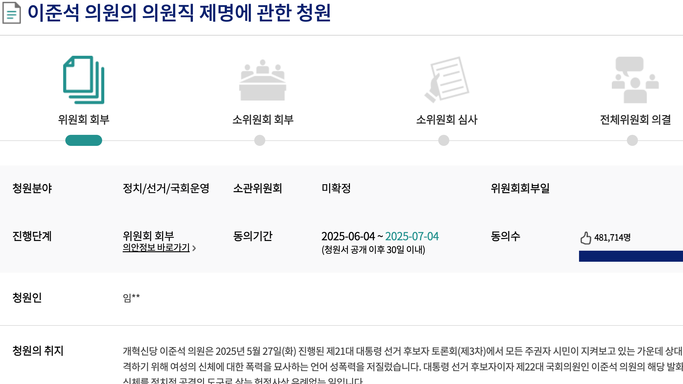 6월 4일 한 시민이 국회 국민 동의 청원 사이트에 개혁신당 이준석 의원의 의원직을 제명해 달라는 청원을 올리면서, 대선 3차 TV 토론에서 당시 이준석 후보가 성폭력을 묘사한 표현을 인용한 것은 "상대 공격을 위해 저지른 언어 성폭력"이자, "여성의 신체를 정치적 공격의 도구로 삼은 것"이라고 강하게 비판했습니다.