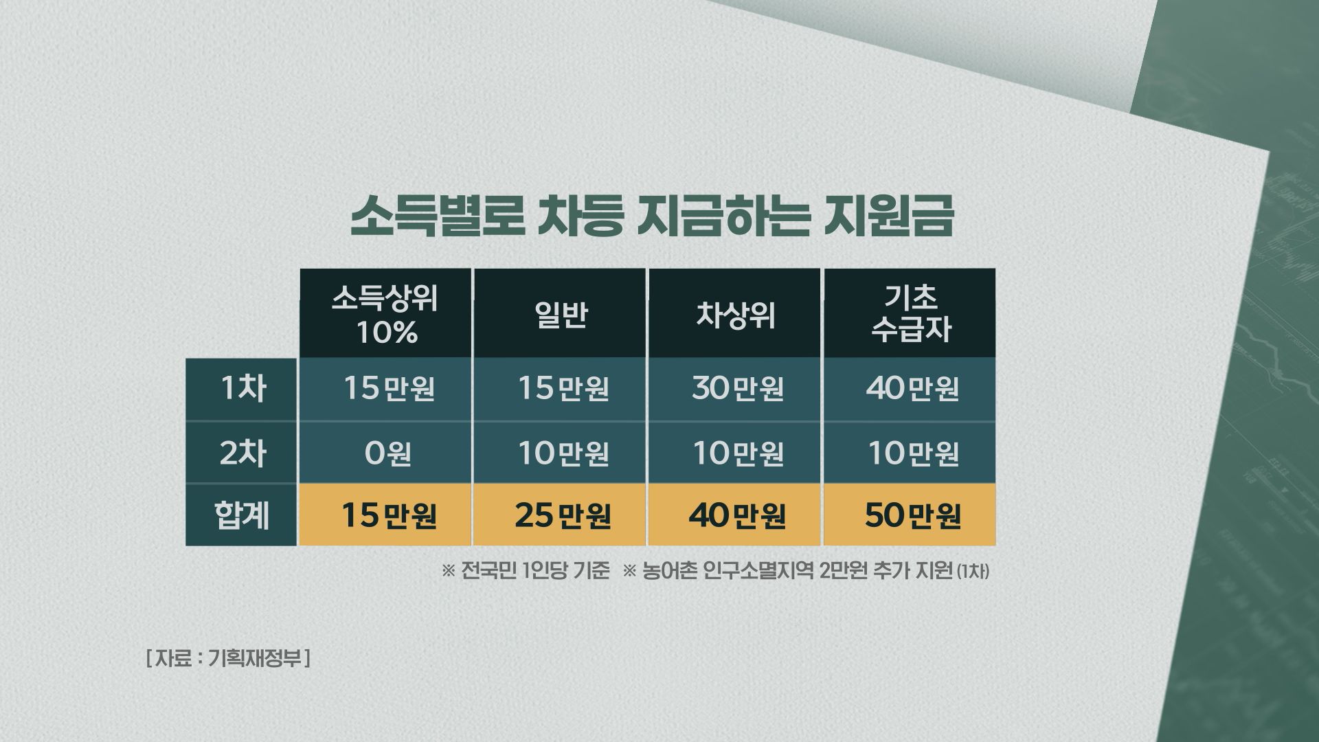 민생회복 소비쿠폰에 쓰이는 예산은 13조2000억 원으로 추경안의 절반을 차지하는데요. 정부는 보편 지급이 아닌 '소득별'로 나눠 차등 지급하기로 했습니다. 512만 명인 상위 10%에는 15만원, 4천 200여 만 명의 일반 국민에 25만 원, 차상위 38만 명 40만 원, 기초수급자 271만 명은 50만 원을 지급합니다. 농어촌 인구소멸지역은 2만 원이 추가됩니다.