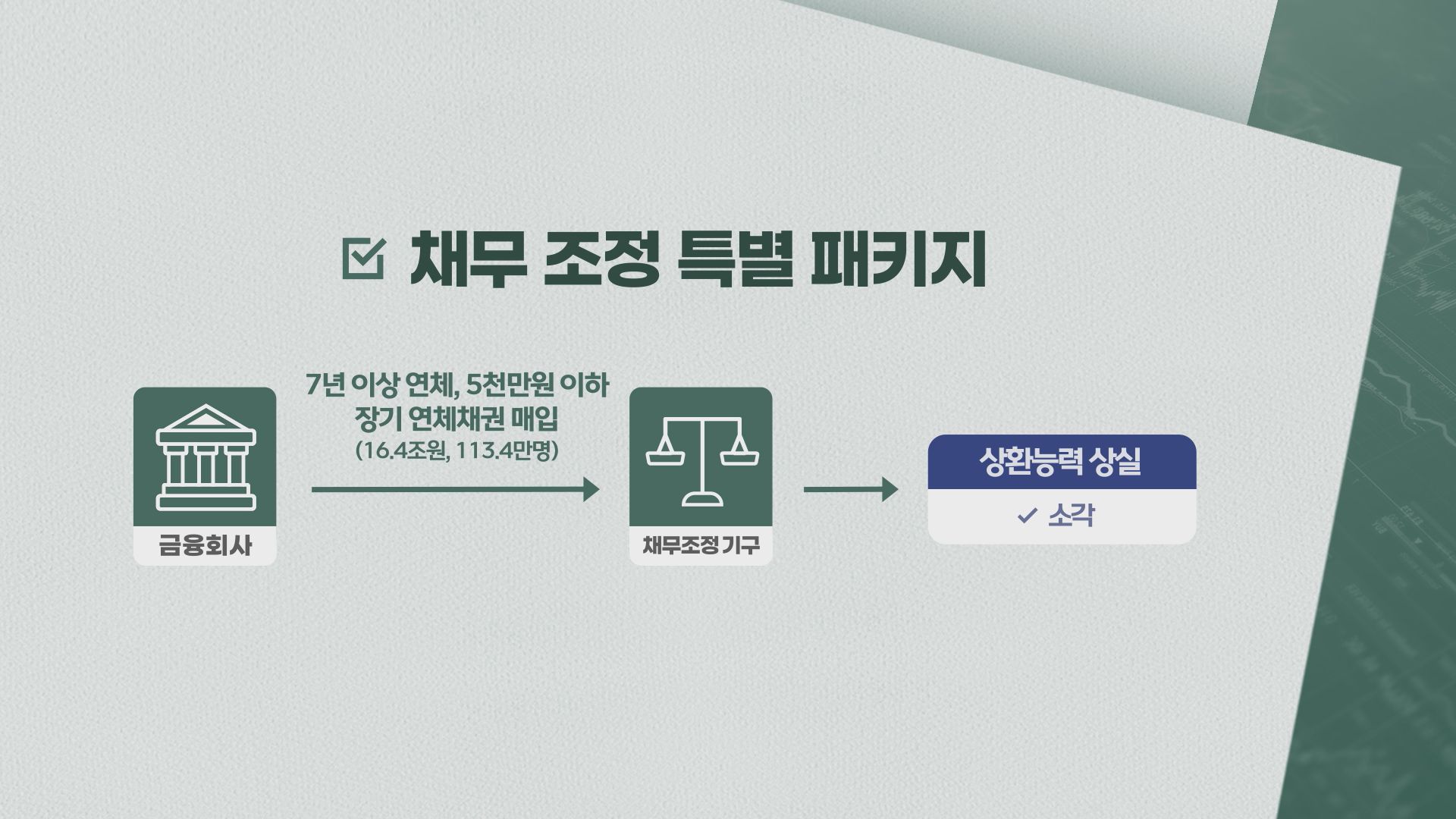 2차 추경에 따라 금융위원회는 7년 이상 연체된 5천만 원 이하 개인 무담보 채권을 일괄 매입해 채무조정 합니다. 매입 채권 규모는 16조 4천억 원으로 113만 4천 명이 혜택을 받을 것으로 추정되는데요. 심사를 거쳐 개인 파산에 준하는 수준의 상환능력을 상실한 경우로 인정되면 해당 채권은 소각됩니다.