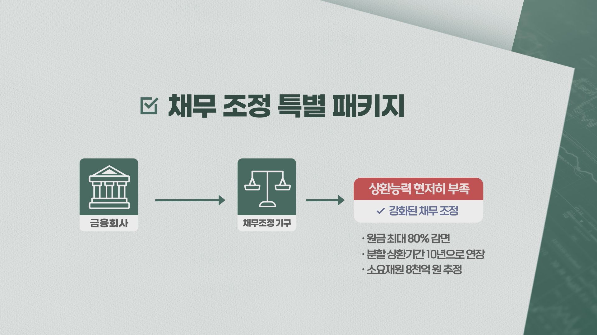 또, 채무에 비해 상환능력이 현저히 부족한 경우에는 원금을 최대 80% 감면해 주고 분할 상환 기간을 10년으로 늘리는 채무조정이 이뤄지는데요. 소요 재원은 8천억 원으로 추정하고 있습니다. 이밖에 지방의 준공 후 미분양 매입 등 건설경기 활성화를 위해 2조 7천억 원, 고용 안전망 강화에 1조 6천억 원을 편성했습니다.