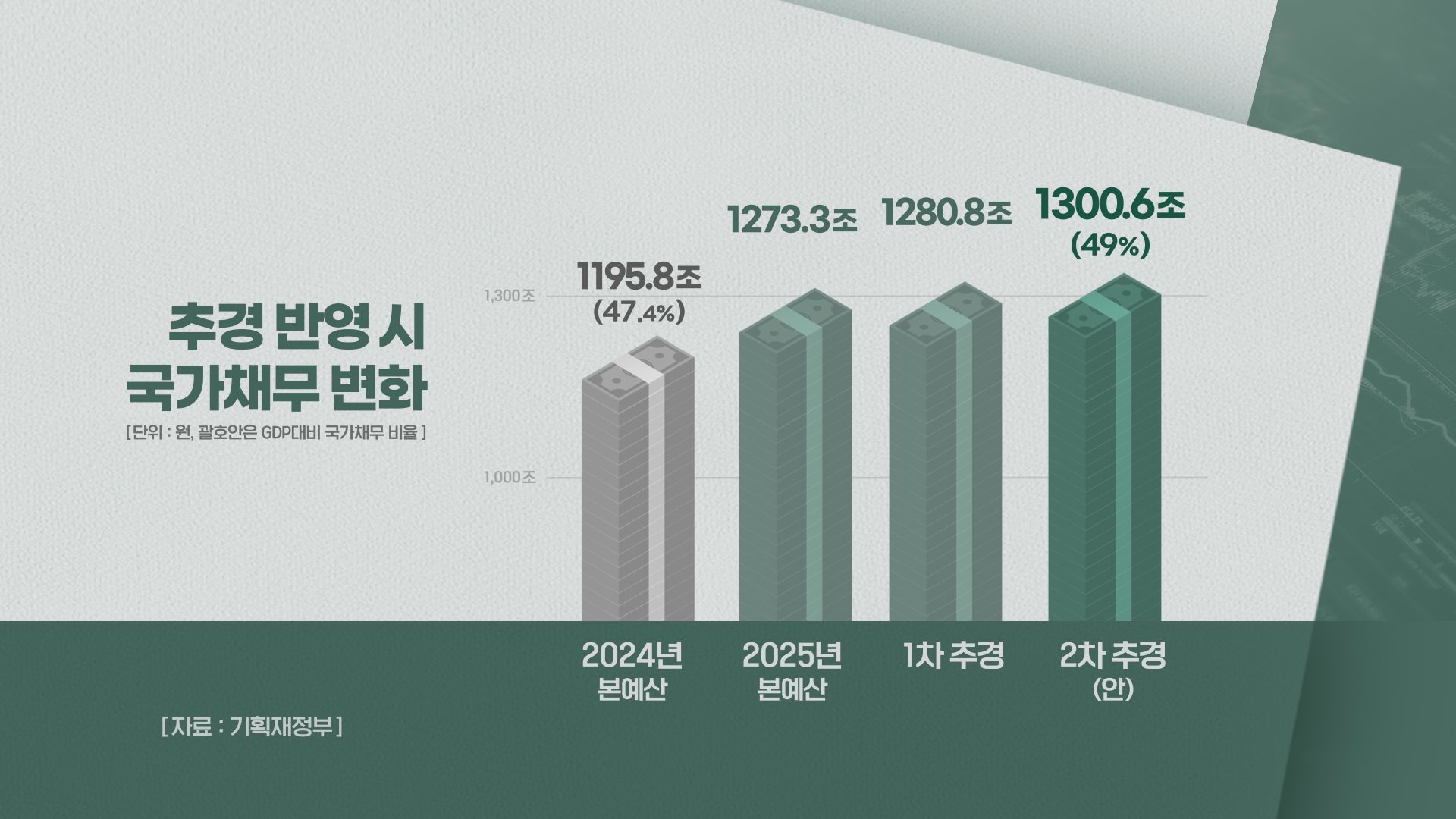 이번 추경으로 2025년 총지출은 702조 원으로 지난해보다 6.9% 늘어나게 됩니다. 총지출이 700조 원을 넘는 건 처음입니다. 또, 지출이 늘면서 관리재정수지 적자 규모는 GDP 대비 2024년 3.3%에서 2025년 4.2%로 높아지고, 국채 발행 증가로 2025년 말 국가채무는 1,300조 원을 넘겨 GDP의 49%에 달할 전망인데요. 나랏빚 비율이 나쁜 건 아니지만, 빚이 늘어나는 속도가 빠른 점은 주의해야 한다는 지적도 있는데요. 재정 건전성 악화를 감수하더라도 소비와 투자 활성화가 성장 회복으로 이어지는 선순환 구조로 만들겠다는 게 정부 입장입니다.