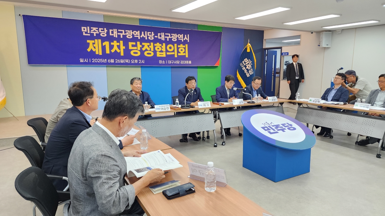 허소 민주당 대구시당 위원장을 비롯한 구군 지역위원장과 김정기 대구시장 권한대행을 비롯한 대구시 실·국장들은 6월 26일 오후 민주당 대구시당에서 대구 지역 현안의 실행 방안을 놓고 머리를 맞댔습니다.