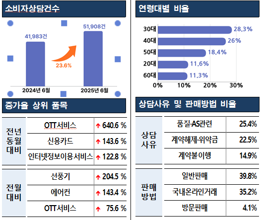 2025년 5월 대비 소비자 상담 증가율 상위 품목은 '선풍기' 204.5%(270건), '에어컨' 143.4%(542건)로, 여름철 무더위 관련 품목이 상위를 차지했습니다.