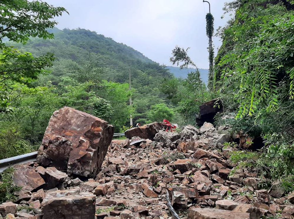 쏟아진 흙과 바위들이 왕복 2차로를 덮치면서 일대 통행이 금지됐습니다.