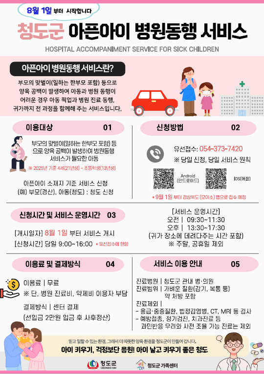 청도군은 8월 1일부터 4세 이상(2021년생) 12세 이하(초등학생) 어린이를 대상으로 하는 아픈 아이 병원 동행 서비스를 정식 운영한다고 밝혔습니다.