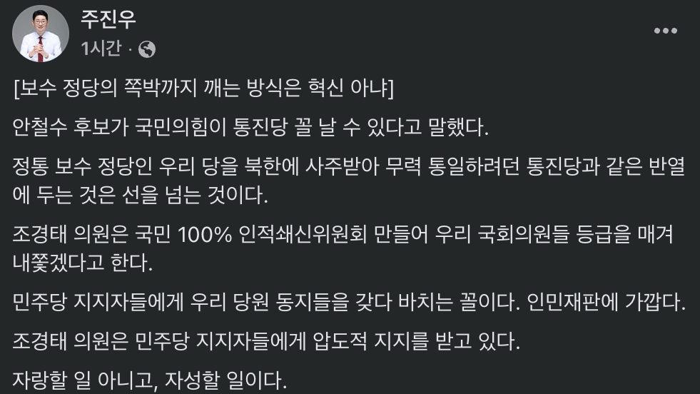 주 의원은 자신의 SNS에, 앞서 안 의원이 '국민의힘은 통진당 꼴 날 수 있다'고 경고한 것과 관련해 "우리 당을 통진당과 같은 반열에 두는 것은 선을 넘는 것"이라고 지적했습니다.