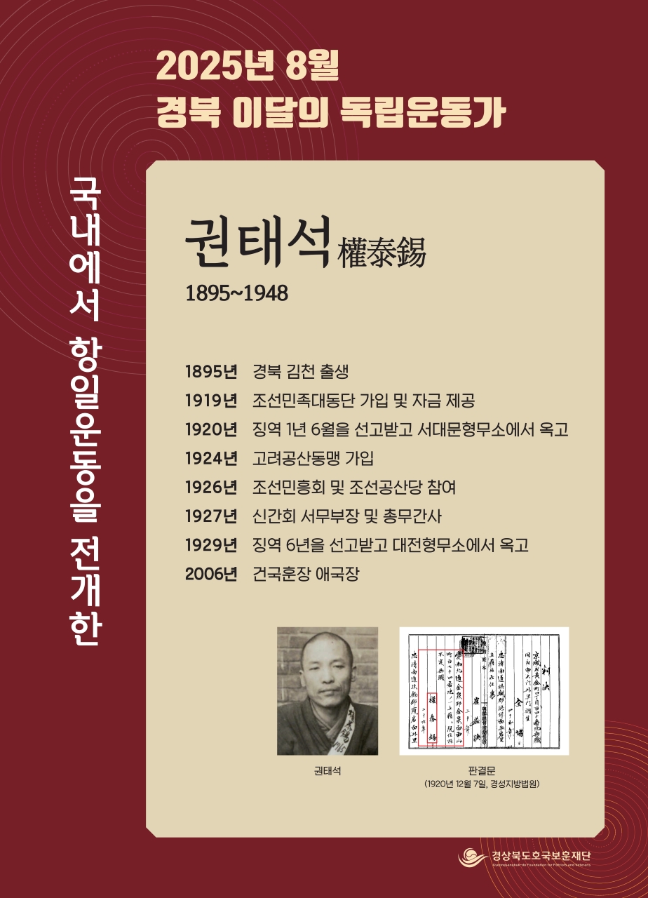 경상북도 호국보훈재단은 조선민족대동단에서 활동한 권태석 선생을 8월의 독립운동가로 선정했습니다.