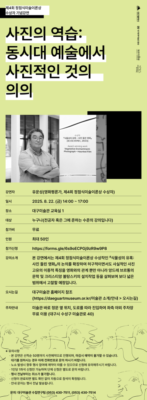 제4회 정점식 미술 이론상 수상 기념 강연이 오는 8월 22일 오후 2시 대구미술관 교육실 1에서 열립니다.