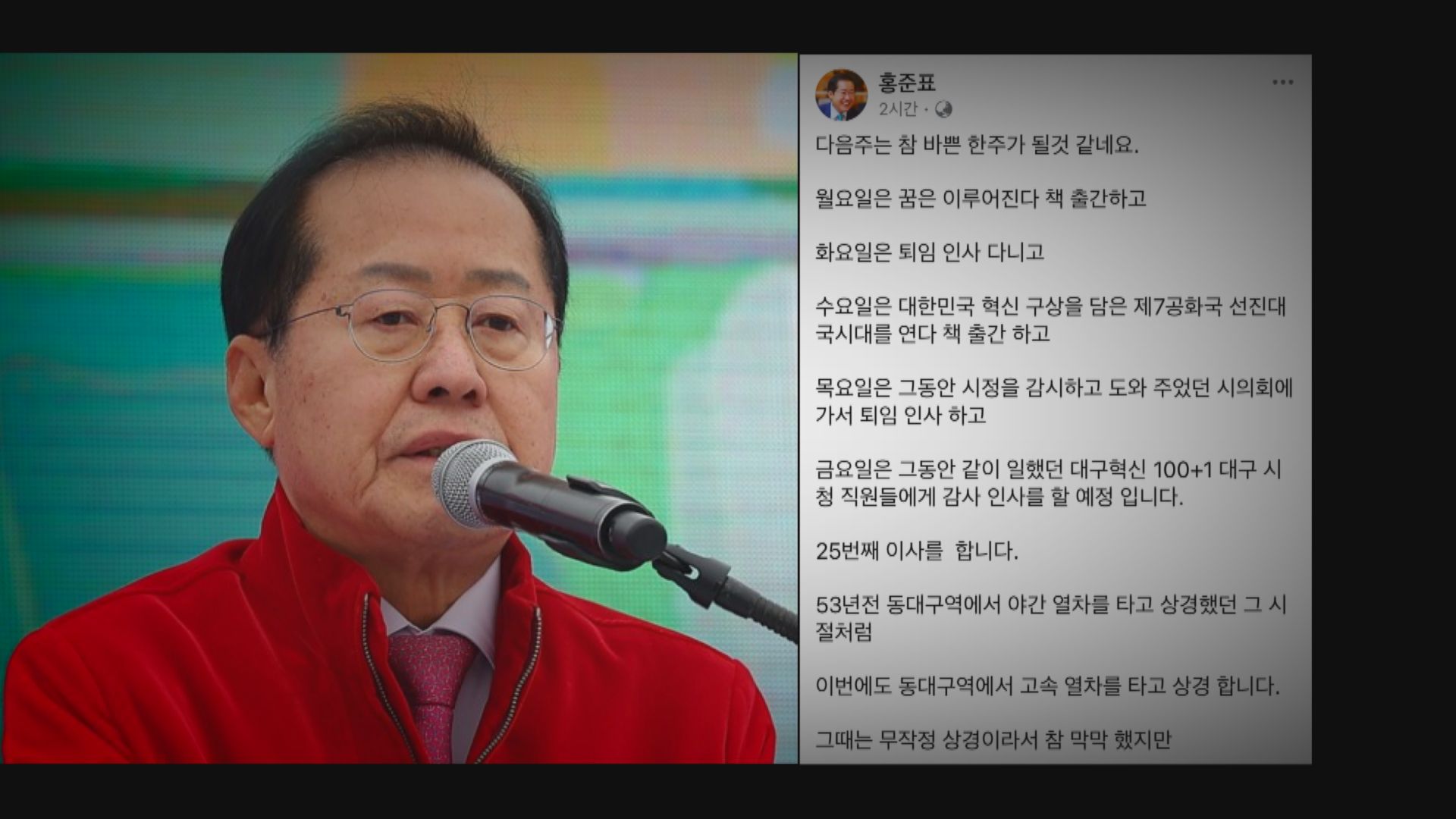 홍준표 대구시장이 다음 주 일정을 예고하며 조기 대선 행보에 나설 것임을 알렸습니다. 홍 시장은 4월 6일 자신의 SNS에 "다음 주는 참 바쁜 한주가 될 것 같다"라면서 "월요일은 '꿈은 이루어진다' 책을 출간한다"라고 밝혔습니다. "화요일은 퇴임 인사 다니고, 수요일은 대한민국 혁신 구상을 담은 '제7공화국 선진대국...