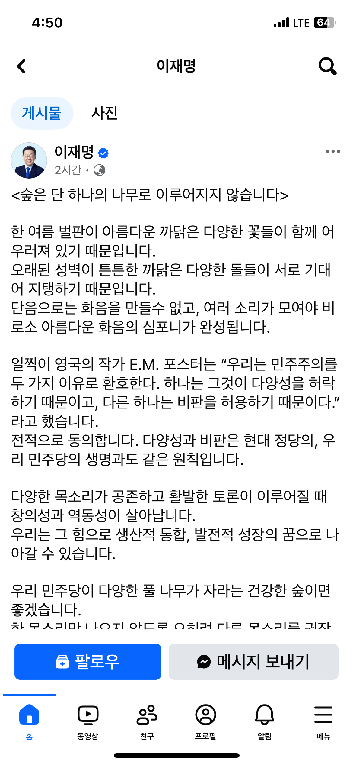 더불어민주당의 비명계 인사들이 '이재명 대표의 일극 체제'를 비판하자, 이 대표는 '숲은 단 하나의 나무로 이뤄지지 않는다'는 제목의 글을 올려 다양성과 비판은 민주당의 생명과도 같은 원칙이라고 밝혔습니다.이 대표는 2월 3일 자신의 SNS에 "한여름 벌판이 아름다운 까닭은 다양한 꽃들이 함께 어우러져 있기 때문"...