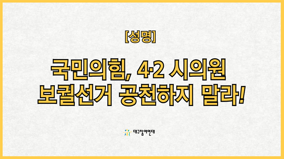 대구참여연대는 2025년 4월 2일 치러질 달서구 대구시의원 보궐선거에 국민의힘은 후보를 공천하지 말라고 촉구했습니다. 참여연대는 "국민의힘 소속 전 시의원이 선거법을 위반해 벌금 400만 원을 선고받아 의원직을 잃었기 때문에 귀책 사유가 국민의힘에 있다"라고 지적했습니다. "그럼에도 벌써 2명의 국민의힘 예비후...